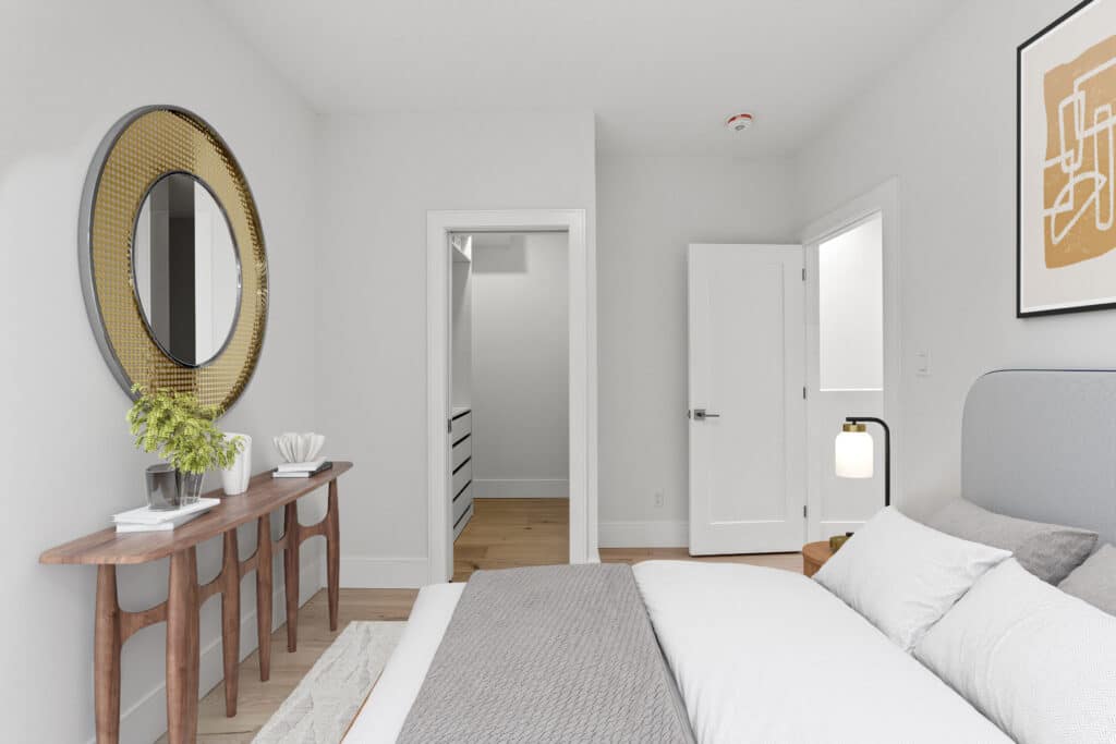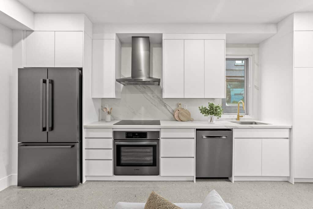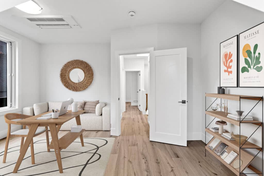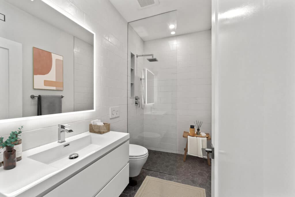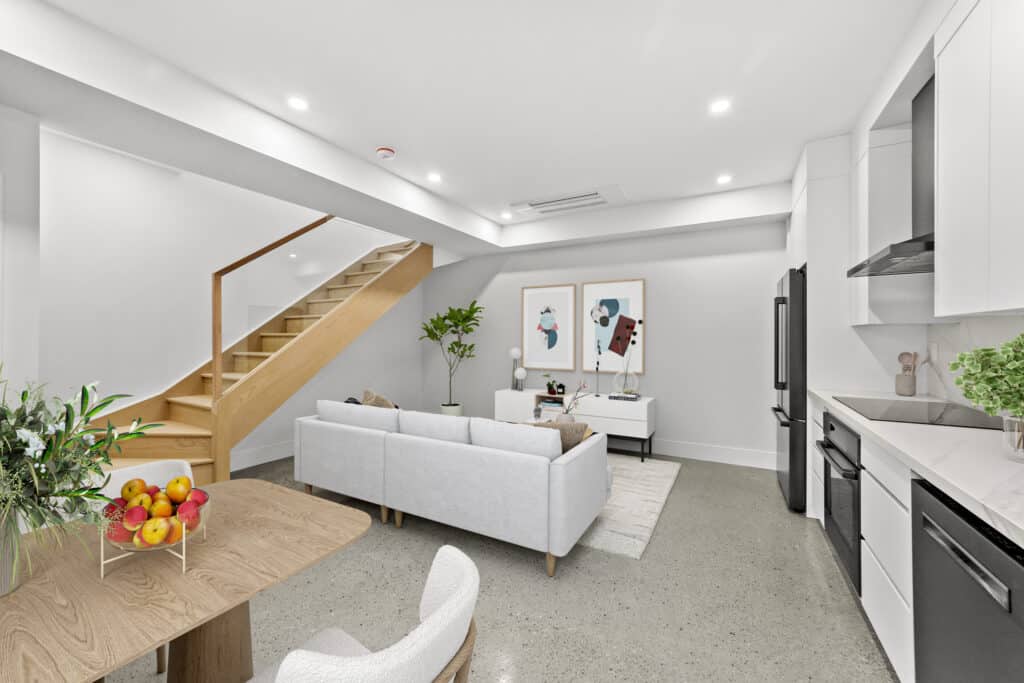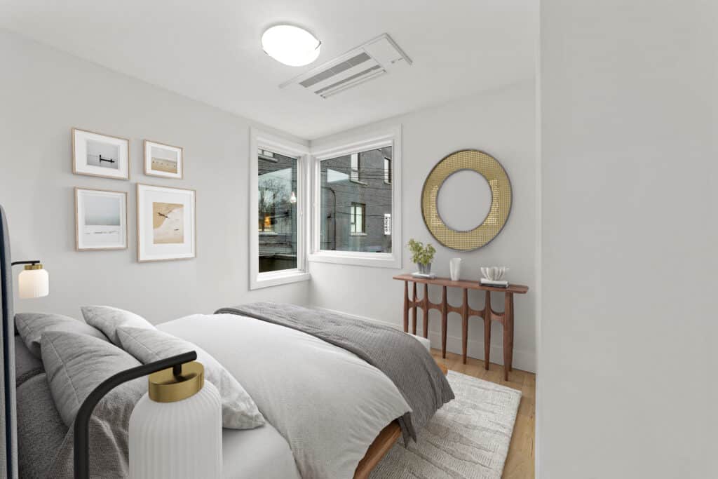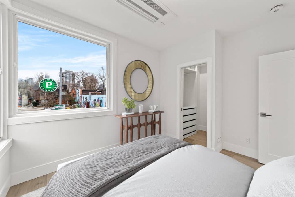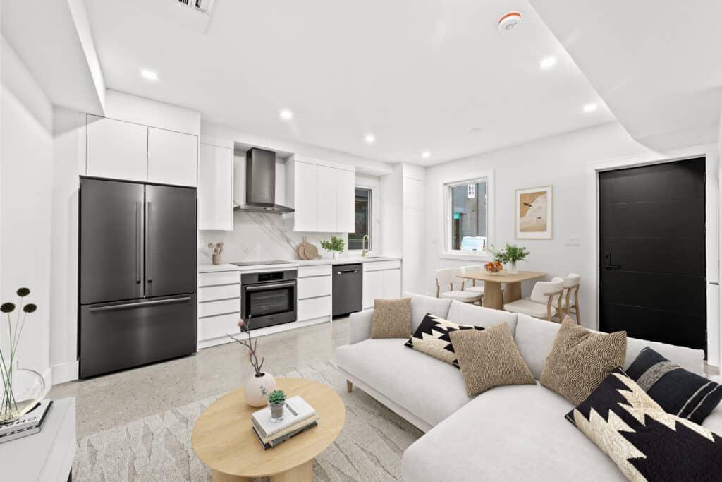 This remarkable 2-storey residence spans 1,200 square feet and boasts distinctive features such as a striking architectural block wall facade adorned with commissioned graffiti, a ground floor with polished concrete flooring, and custom millwork and floor-to-ceiling cabinetry. Abundant natural light bathes the space, accentuating the sleek and modern design. The home’s thoughtful touches include a curbless shower, wall-hung toilet and vanity, and an open-concept living area, making it an urban oasis that seamlessly blends comfort, style, and functionality.
